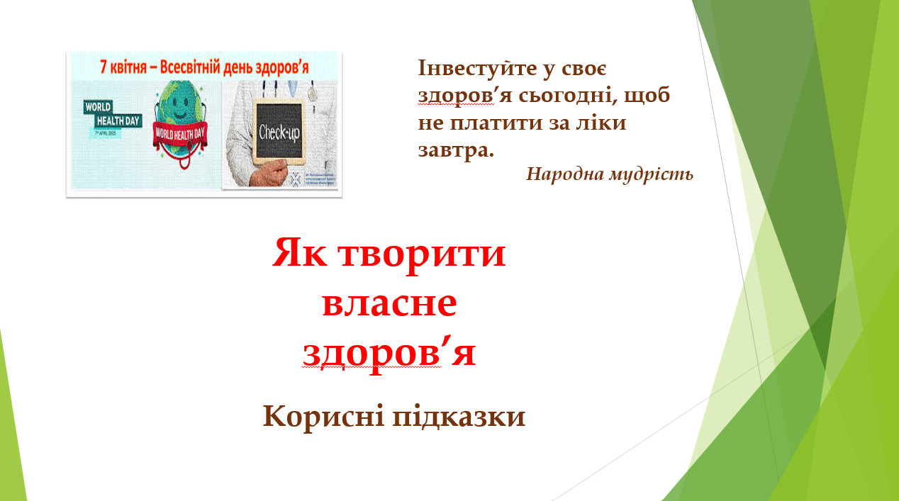 Друзі! Представляємо до вашої уваги корисні підказки «Як творити власне здоров’я», які було підготовлено з нагоди Всесвітнього дня здоров’я. Подію відзначають 7 квітня, а започаткована вона на честь прийняття статуту Всесвітньої організації охорони здоров’я (ВООЗ) у 1948 році. Дбати про себе завжди на часі!